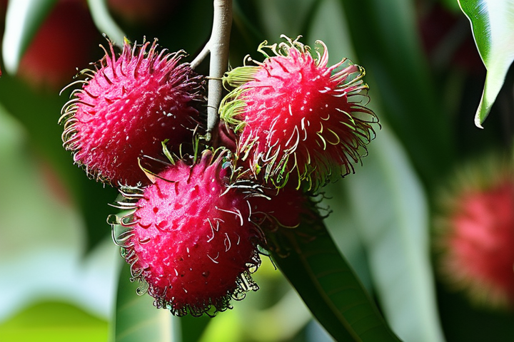 红毛丹的果实呈圆形或卵圆形,直径约1-2厘米,成熟的红毛丹外壳为鲜红色,果肉饱满,质地柔软,并非所有的红毛丹都是完美的,有些果实可能会出现颜色不均或发青的现象。